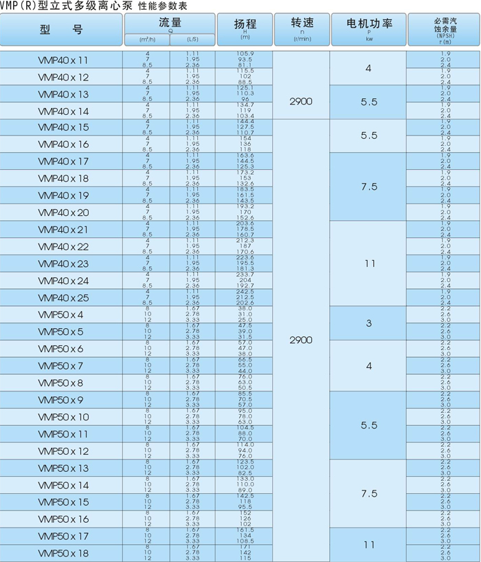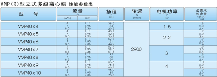 型号说明: VMP 40 * 8 │ │ │ │ │ 泵的级数。 │ 吸入、排出口径。 立式多级离心泵。