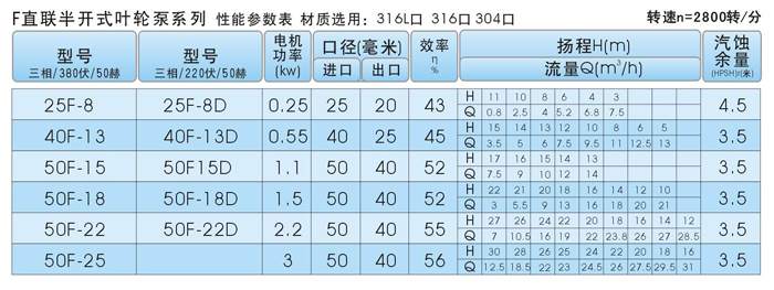 产品名称: 40F-13污水提升泵 产品说明: 不锈钢材质分:304,316,316L三种不同材质,可根据客户输送介质不同腐蚀程度而定。
