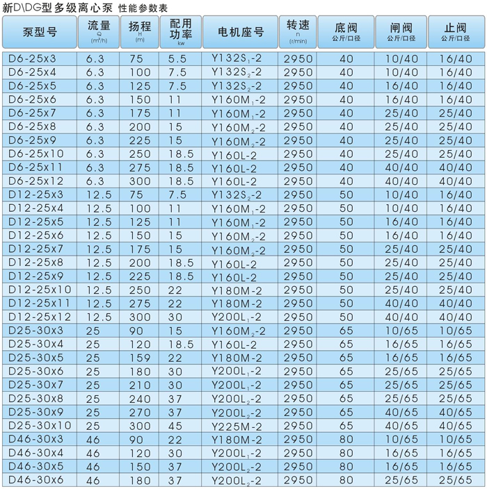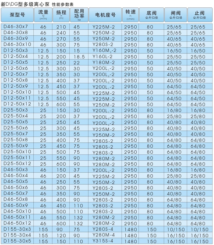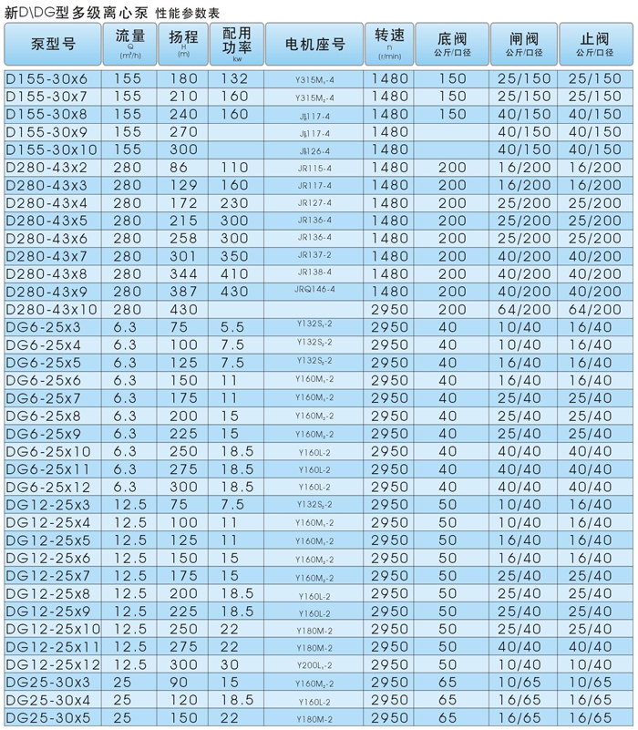 D、DG型卧式、单吸多级、分段式离心泵。具有效率高、性能范围广、运行安全平稳、噪音低、寿命长、安装维修方便等特点。供输送清水或物理化学性质类似于水的其它液体。也可以通过改变泵过流部件材质、密封形式和增加冷却系统用于输送热水、油类、腐蚀性或含磨粒的介质。产品执行JB/T1051-93《多级清水离心泵型式与基本参数》标准。